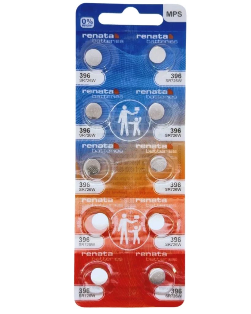Equivalent: Energizer 396, Maxell SR726W, Varta V396, Rayovac 396, Duracell D396/397, Timex V, Citizen 280-52, Seiko SB-BL, I.E.C SR726 (SR59)